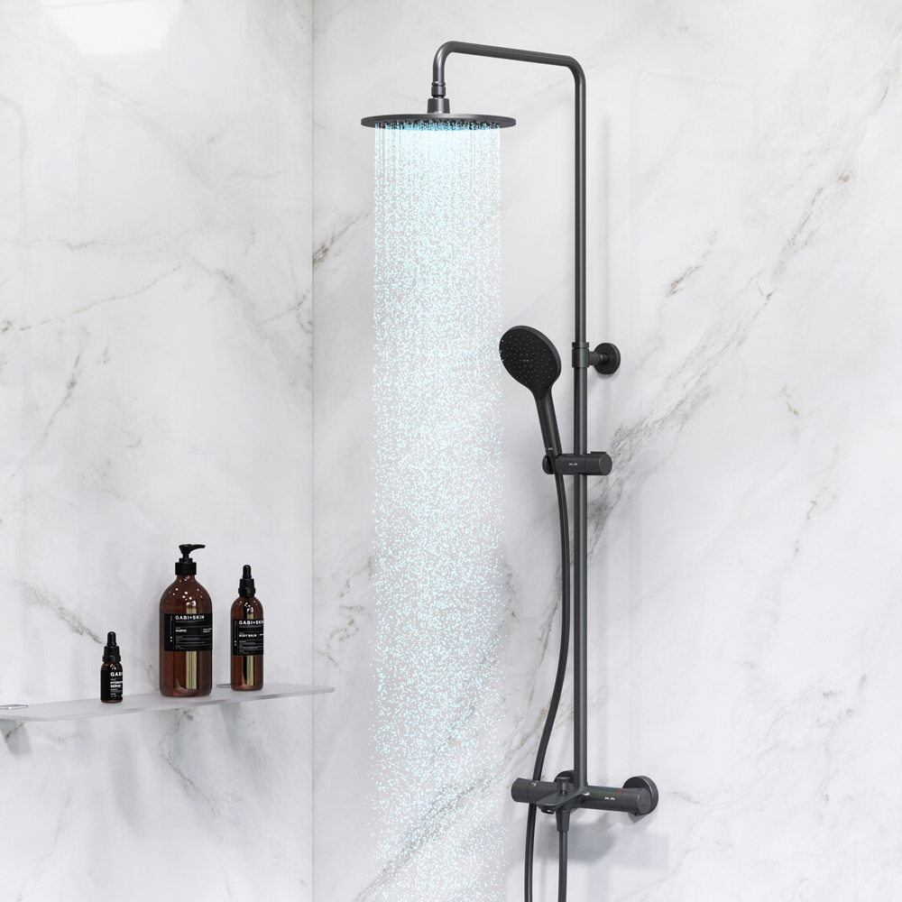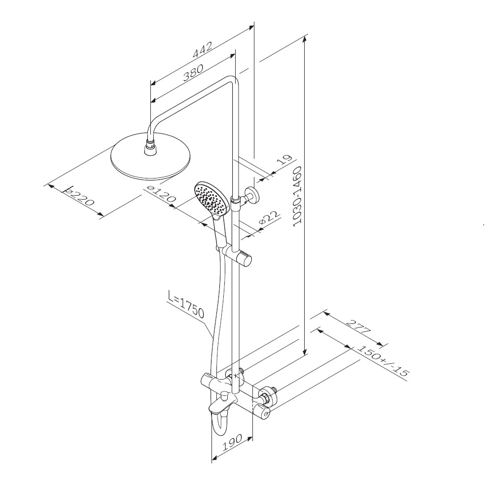 Продуманные детали для удобства использования: штанга регулируется по высоте в диапазоне от 1030 до 1460 мм, обеспечивая комфорт для людей любого роста, шаровый шарнир в держателе верхнего душа позволяет регулировать угол его наклона, душевой шланг 1750 мм, верхний душ диаметром 220 мм, ручной душ диаметром 120 мм.