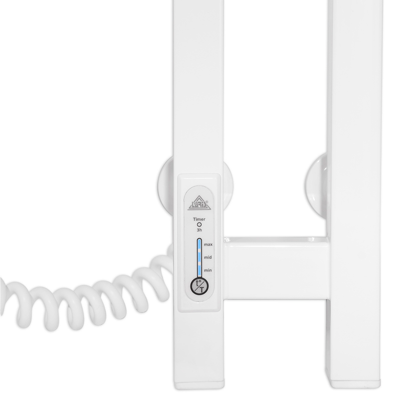 Полотенцесушитель ТМ «Laris» изготовлен из конструкционной стали, поверхность изделия покрыта белой порошковой краской RAL 9016. Перед покраской поверхность изделия проходит процесс фосфатирования. Фосфатная пленка позволяет в несколько раз улучшить защитные характеристики и срок эксплуатации лакокрасочного покрытия. Температура поверхности изделия 50±5°C. Проверка на пробой изоляции производится напряжением в 1500В. Регулировать степень нагрева можно с помощью встроенного терморегулятора, обеспечивающий эффективное использование электроэнергии. У полотенцесушителя есть возможность скрытого подключения.