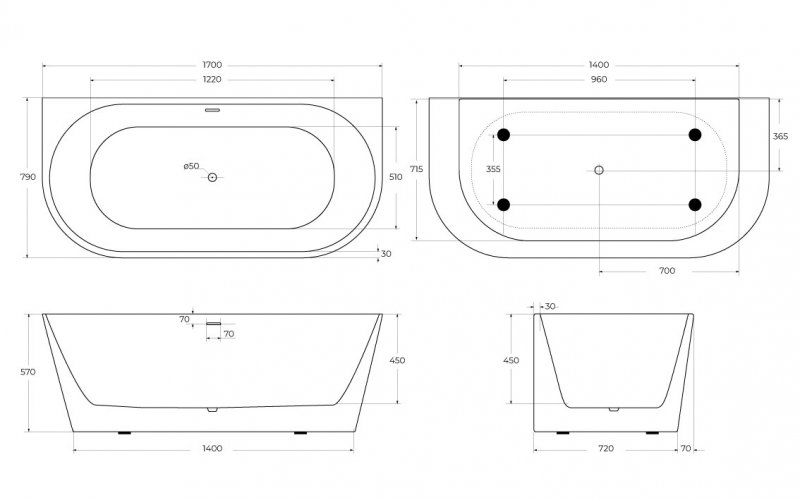 Расположение перелива: сливное отверстие посередине дна ванны стандартно